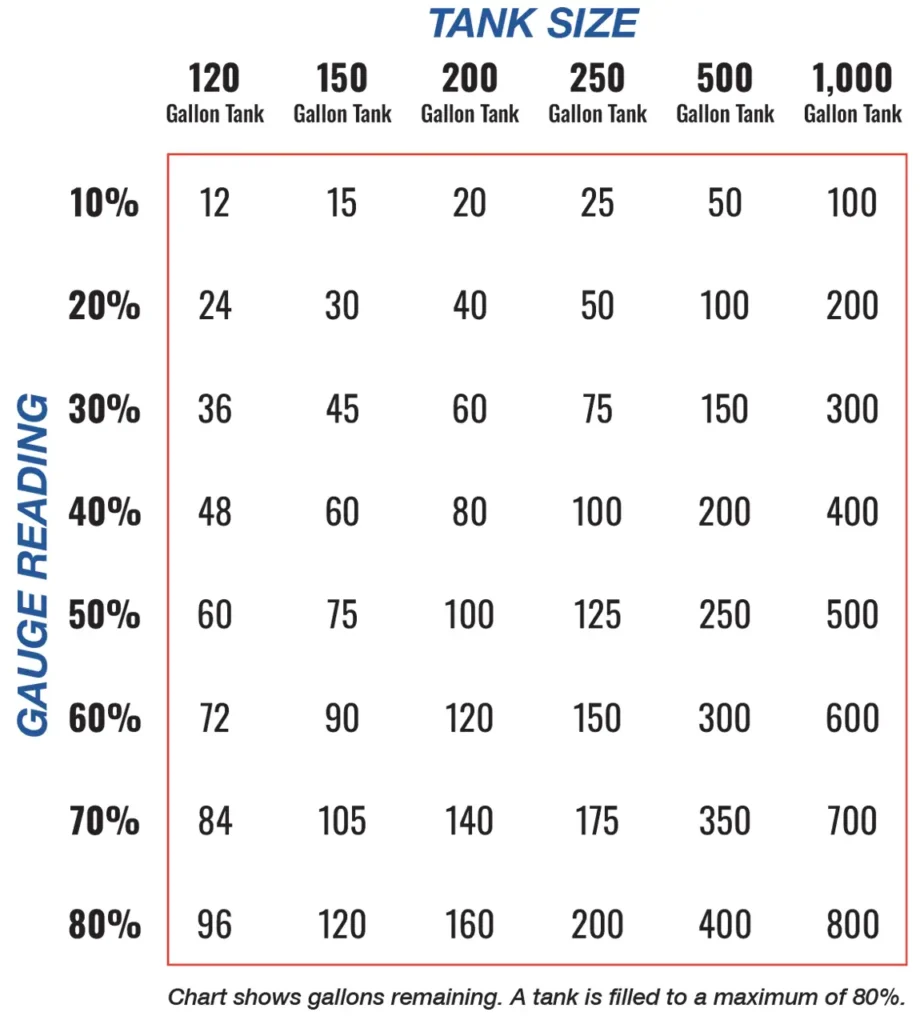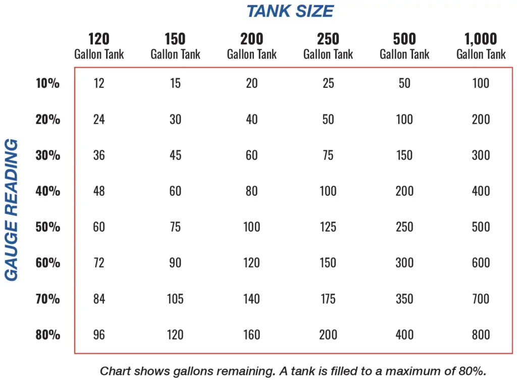 Listed below is a handy chart to help you understand how much propane is in your tank based on readings from the gauge.